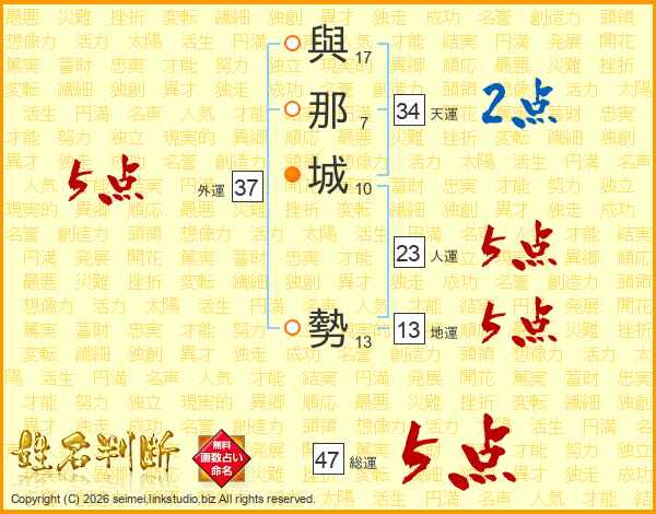 生活面を象徴する運勢です。外部から受ける影響力を表し、結婚運、家庭運や職場、環境への順応性を表します。総運から人運を引いた画数。姓や名が1文字の場合を除く。