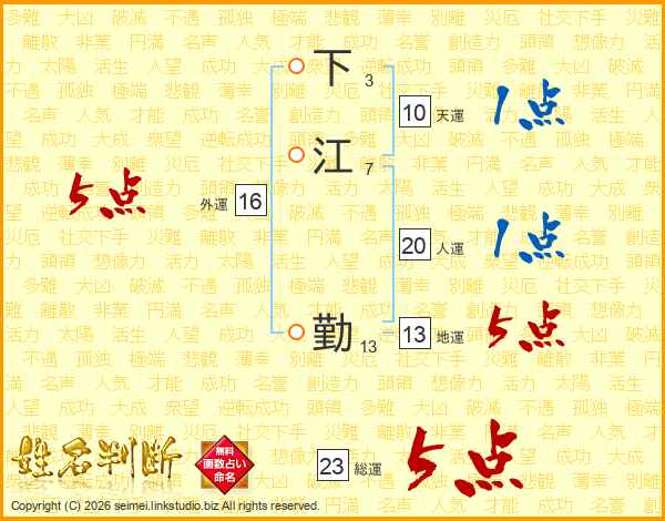 生活面を象徴する運勢です。外部から受ける影響力を表し、結婚運、家庭運や職場、環境への順応性を表します。総運から人運を引いた画数。姓や名が1文字の場合を除く。