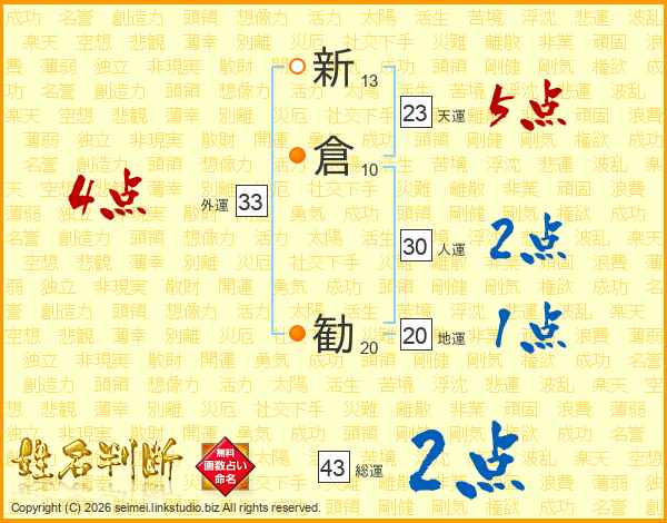 生活面を象徴する運勢です。外部から受ける影響力を表し、結婚運、家庭運や職場、環境への順応性を表します。総運から人運を引いた画数。姓や名が1文字の場合を除く。