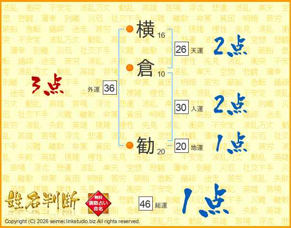 横倉勧さんの総運は46画の1点!