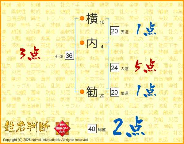生活面を象徴する運勢です。外部から受ける影響力を表し、結婚運、家庭運や職場、環境への順応性を表します。総運から人運を引いた画数。姓や名が1文字の場合を除く。
