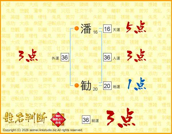 生活面を象徴する運勢です。外部から受ける影響力を表し、結婚運、家庭運や職場、環境への順応性を表します。総運から人運を引いた画数。姓や名が1文字の場合を除く。