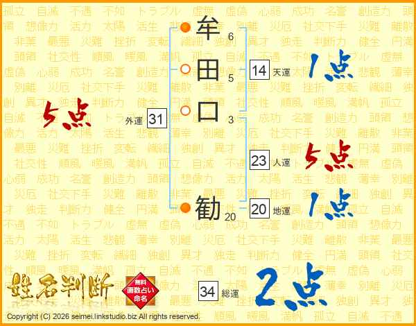 生活面を象徴する運勢です。外部から受ける影響力を表し、結婚運、家庭運や職場、環境への順応性を表します。総運から人運を引いた画数。姓や名が1文字の場合を除く。