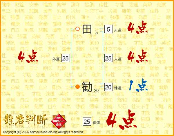生活面を象徴する運勢です。外部から受ける影響力を表し、結婚運、家庭運や職場、環境への順応性を表します。総運から人運を引いた画数。姓や名が1文字の場合を除く。