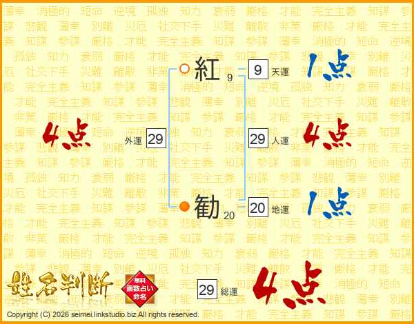 生活面を象徴する運勢です。外部から受ける影響力を表し、結婚運、家庭運や職場、環境への順応性を表します。総運から人運を引いた画数。姓や名が1文字の場合を除く。