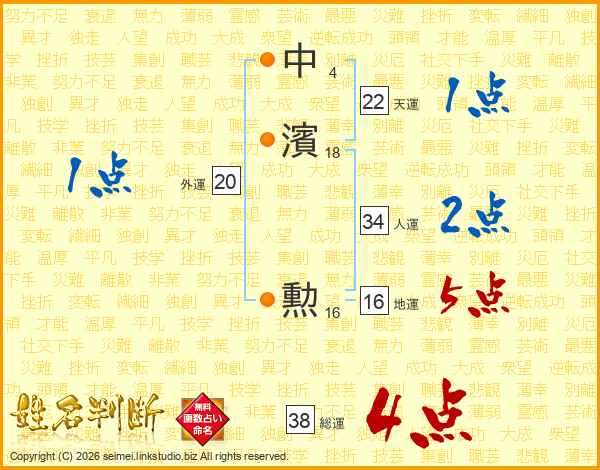 生活面を象徴する運勢です。外部から受ける影響力を表し、結婚運、家庭運や職場、環境への順応性を表します。総運から人運を引いた画数。姓や名が1文字の場合を除く。
