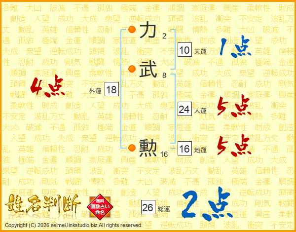 生活面を象徴する運勢です。外部から受ける影響力を表し、結婚運、家庭運や職場、環境への順応性を表します。総運から人運を引いた画数。姓や名が1文字の場合を除く。