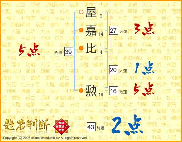 屋(9画)嘉(14画)比(4画) 勲(16画)