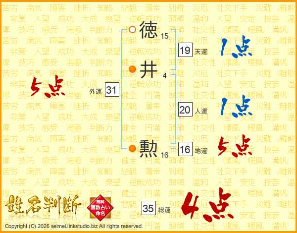 徳(15画)井(4画) 勲(16画)
