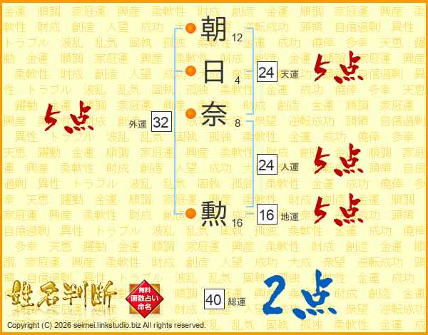 朝(12画)日(4画)奈(8画) 勲(16画)