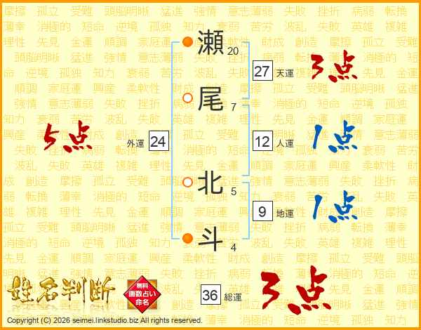 瀬(20画)尾(7画) 北(5画)斗(4画)