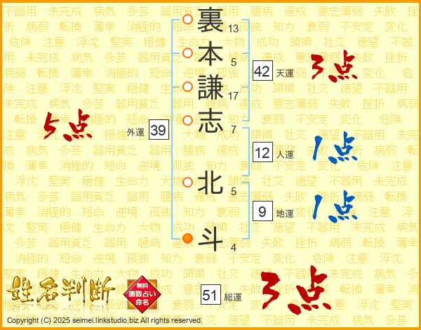 裏本謙志北斗さんの総運は51画の3点!