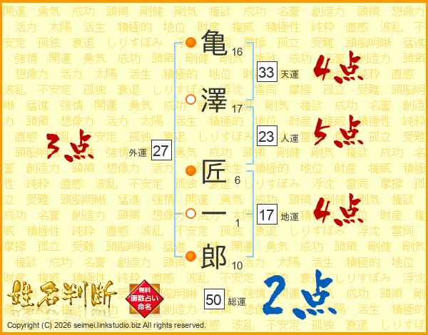 亀(16画)澤(17画) 匠(6画)一(1画)郎(10画)
