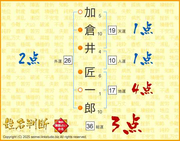加(5画)倉(10画)井(4画) 匠(6画)一(1画)郎(10画)