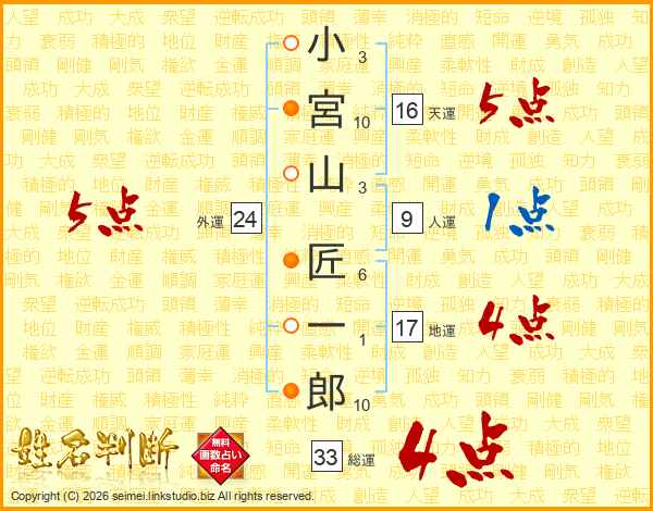 小(3画)宮(10画)山(3画) 匠(6画)一(1画)郎(10画)