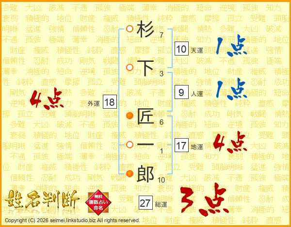 杉(7画)下(3画) 匠(6画)一(1画)郎(10画)
