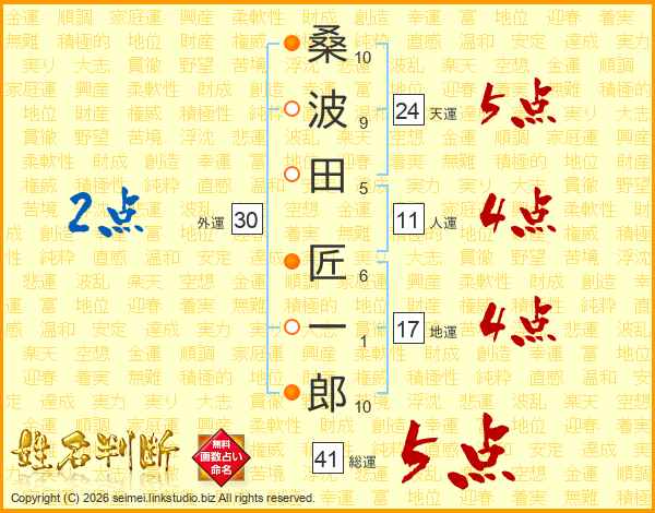桑(10画)波(9画)田(5画) 匠(6画)一(1画)郎(10画)