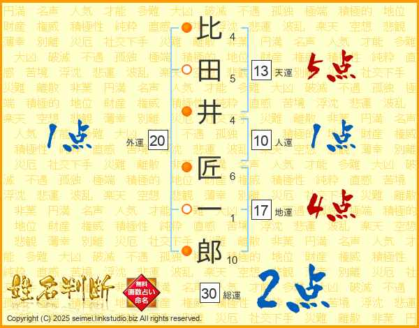 比(4画)田(5画)井(4画) 匠(6画)一(1画)郎(10画)