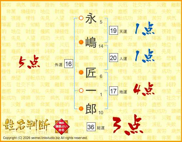 永(5画)嶋(14画) 匠(6画)一(1画)郎(10画)