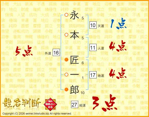永(5画)本(5画) 匠(6画)一(1画)郎(10画)