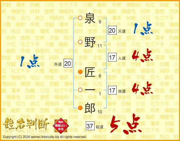 泉(9画)野(11画) 匠(6画)一(1画)郎(10画)