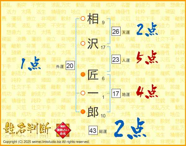 相沢匠一郎さんの総運は43画の2点!
