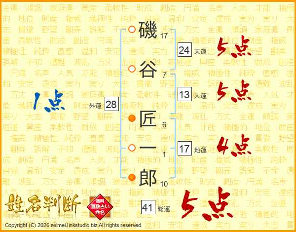 磯(17画)谷(7画) 匠(6画)一(1画)郎(10画)