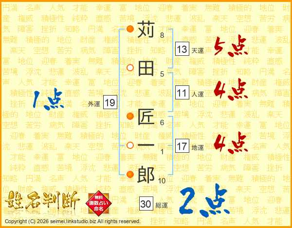 苅田匠一郎さんの天運は13画の5点!