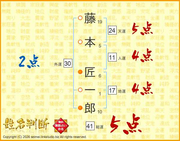 藤(19画)本(5画) 匠(6画)一(1画)郎(10画)