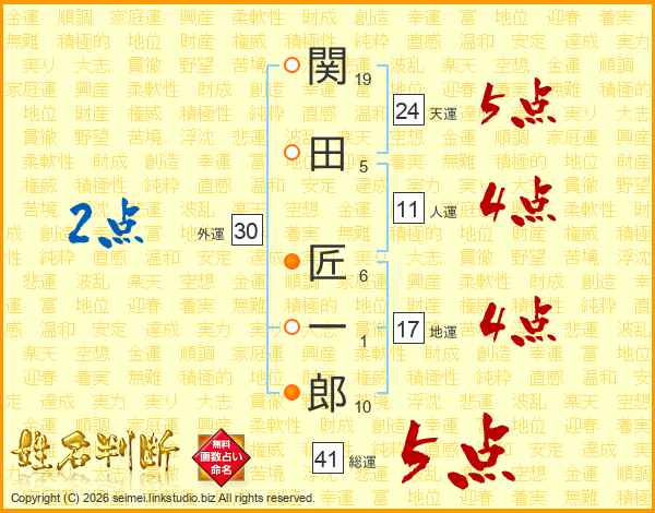 関(19画)田(5画) 匠(6画)一(1画)郎(10画)