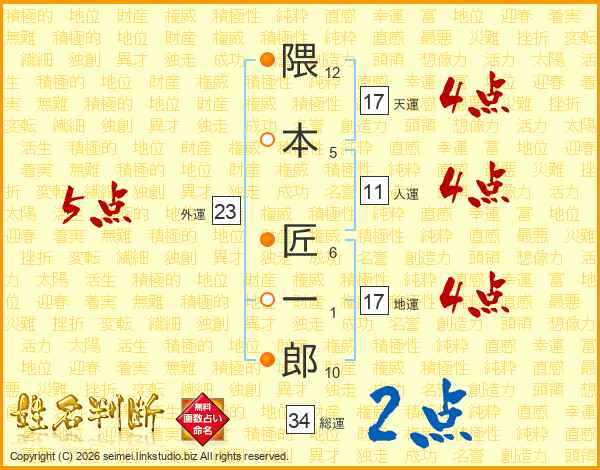 隈(12画)本(5画) 匠(6画)一(1画)郎(10画)