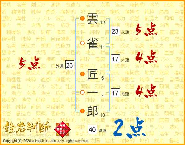 雲(12画)雀(11画) 匠(6画)一(1画)郎(10画)