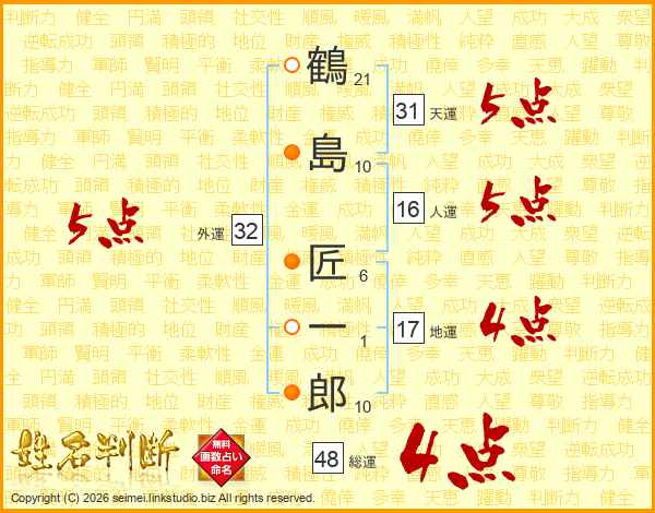 鶴(21画)島(10画) 匠(6画)一(1画)郎(10画)