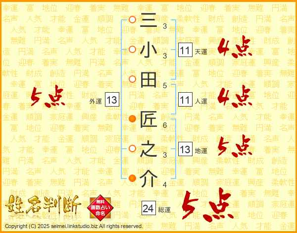 三(3画)小(3画)田(5画) 匠(6画)之(3画)介(4画)