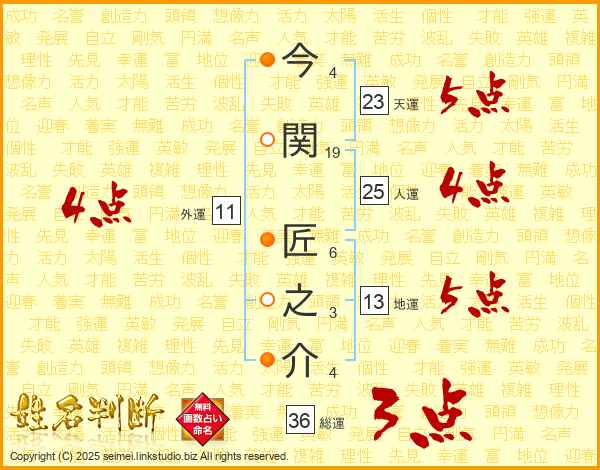 今(4画)関(19画) 匠(6画)之(3画)介(4画)