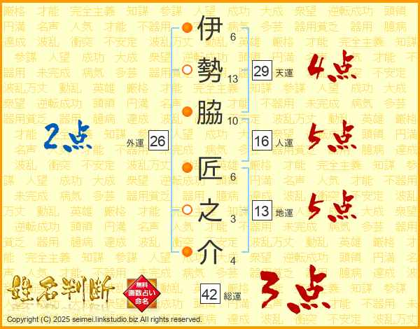 伊(6画)勢(13画)脇(10画) 匠(6画)之(3画)介(4画)