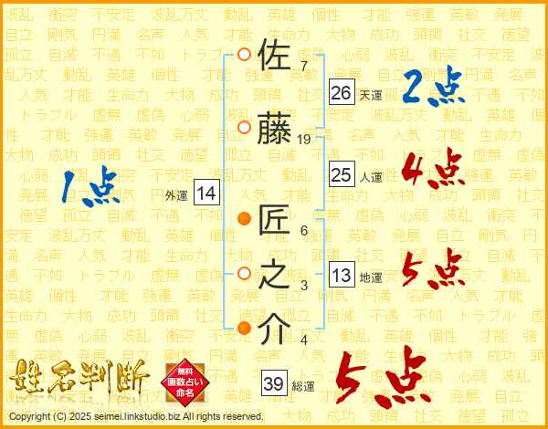 佐(7画)藤(19画) 匠(6画)之(3画)介(4画)