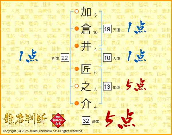 加(5画)倉(10画)井(4画) 匠(6画)之(3画)介(4画)