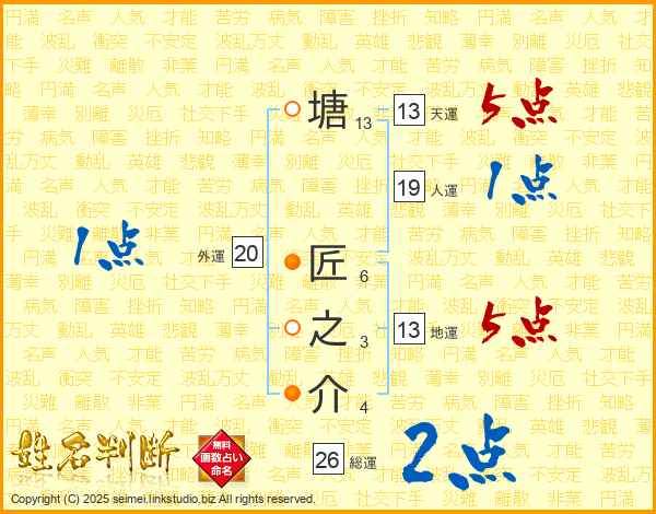 塘匠之介さんの総運は26画の2点!