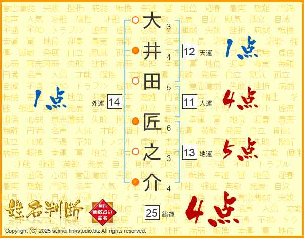 大(3画)井(4画)田(5画) 匠(6画)之(3画)介(4画)