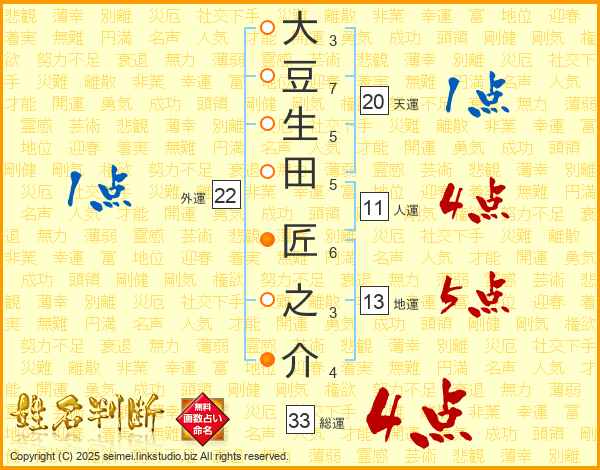 大(3画)豆(7画)生(5画)田(5画) 匠(6画)之(3画)介(4画)