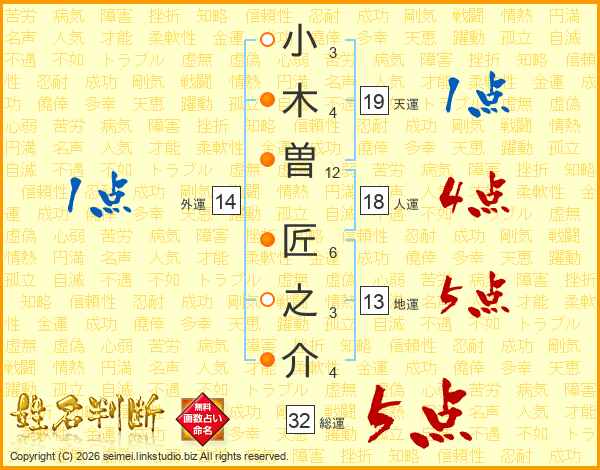 小(3画)木(4画)曽(12画) 匠(6画)之(3画)介(4画)