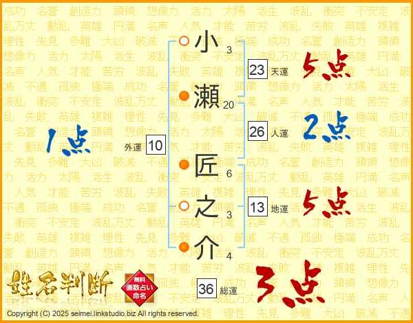 小(3画)瀬(20画) 匠(6画)之(3画)介(4画)