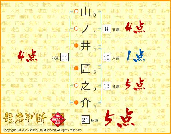 山(3画)ノ(1画)井(4画) 匠(6画)之(3画)介(4画)