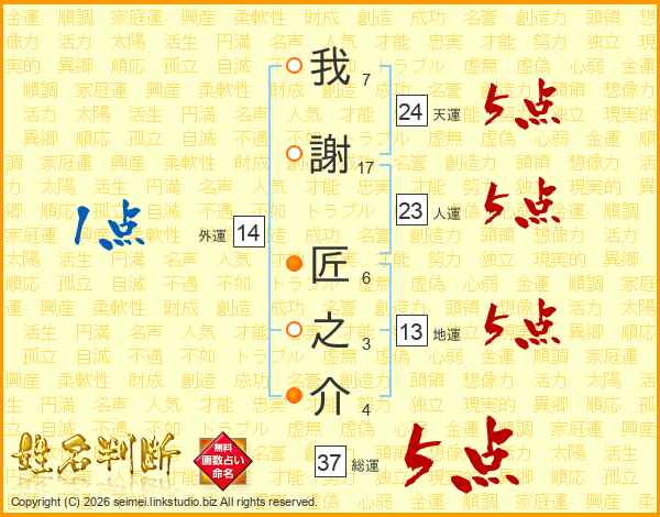 我謝匠之介さんの総運は37画の5点!