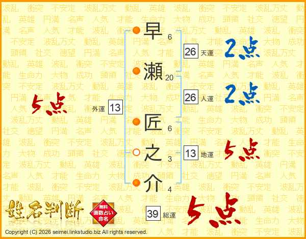 早(6画)瀬(20画) 匠(6画)之(3画)介(4画)