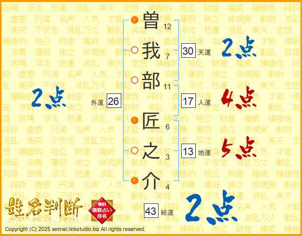 曽(12画)我(7画)部(11画) 匠(6画)之(3画)介(4画)