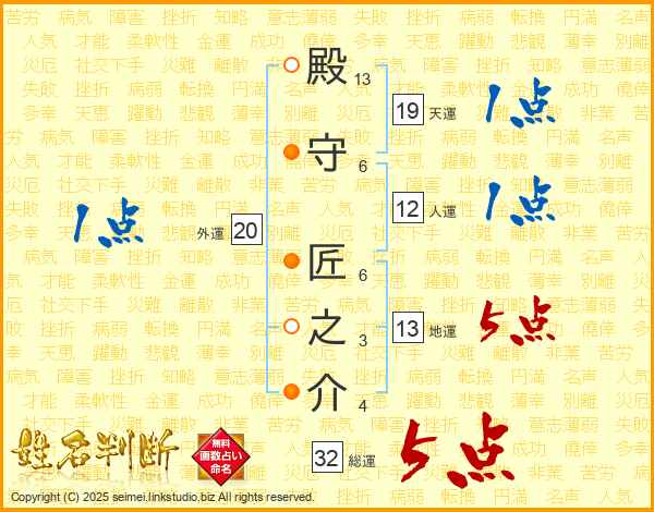 殿(13画)守(6画) 匠(6画)之(3画)介(4画)