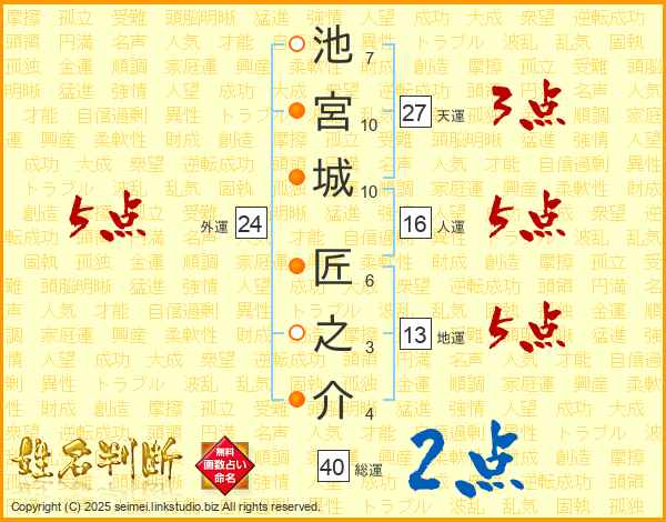 池(7画)宮(10画)城(10画) 匠(6画)之(3画)介(4画)