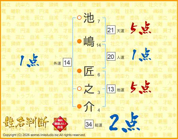 池嶋匠之介さんの天運は21画の5点!